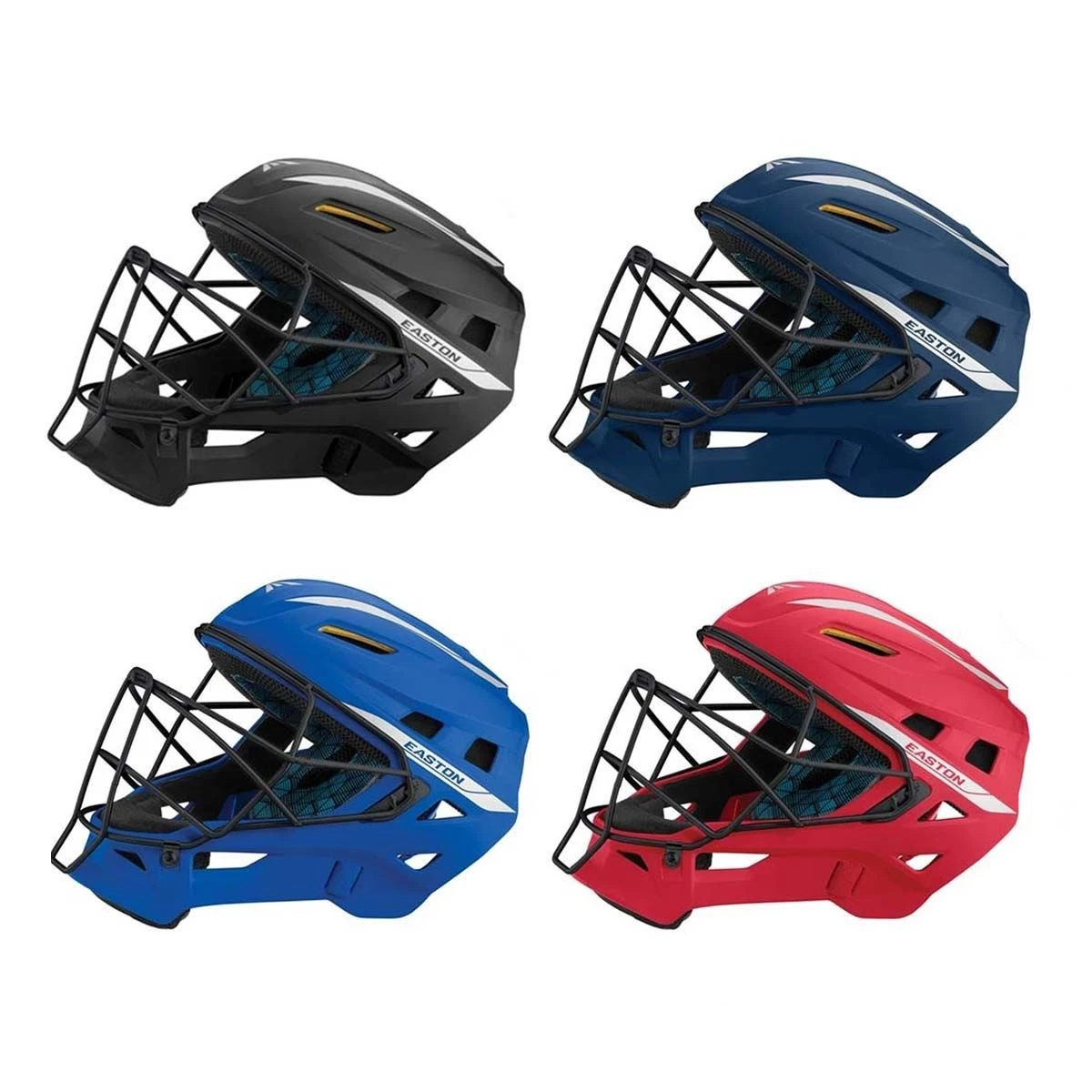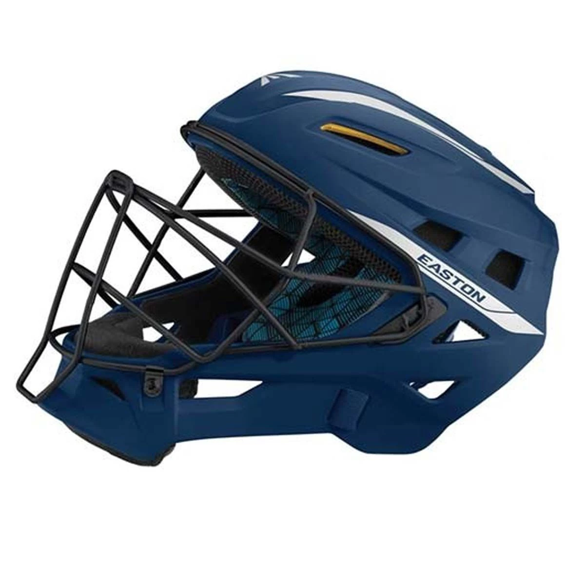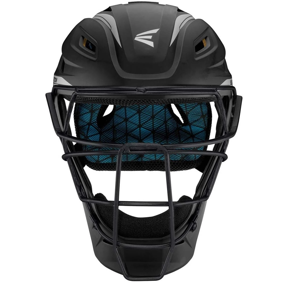 The Pro X catcher’s helmet is an industry best catcher’s helmet for a top level catcher. This baseball catcher’s helmet features a black steel cage with a flat middle bar for increased visibility.Β The ABS plastic shell has strategic air flow vents and the plush wrapped padding with breathable air mesh and BioDri moisture wicking fabric liner that will keep you cool behind the plate on gameday. The ergonomic chin cup design allows for better fit and communication with your pitcher. The Easton catcher’s helmet meets the NOCSAE standard for catcher’s helmets.