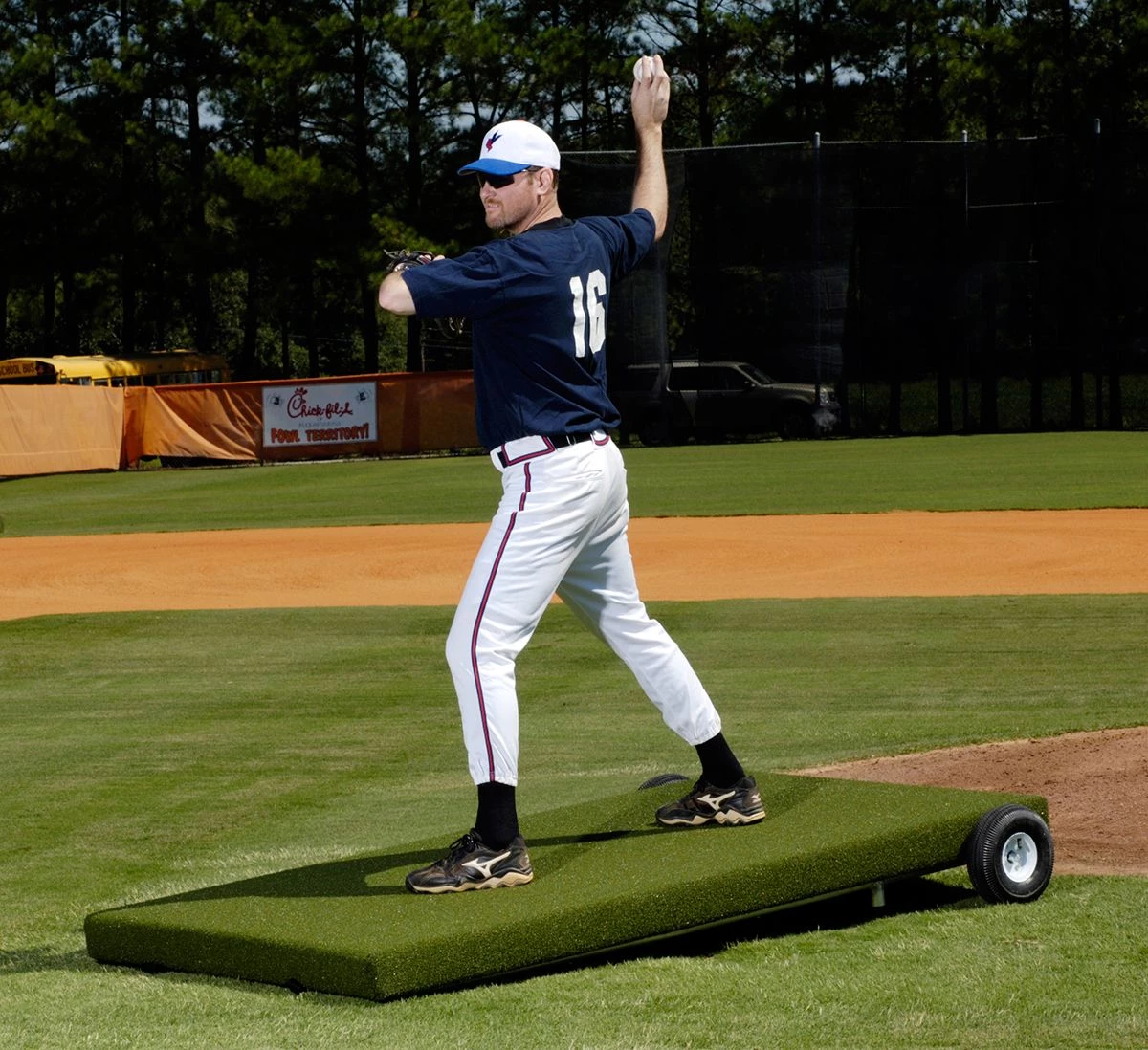 The Proper Pitch pitching platform is perfect for use on the field. By using the platform, you can protect your pitching mound during practice. The platform will not flatten grass and even allows airflow underneath to keep the grass green. Transport is easy with pneumatic tires.
