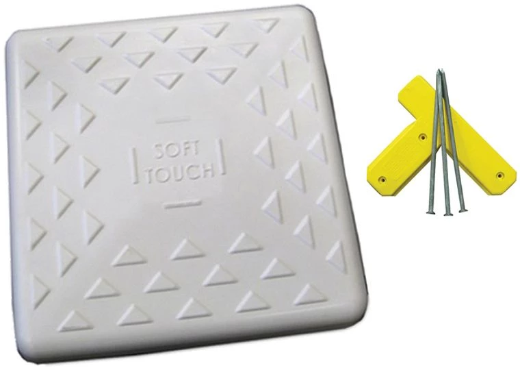 The 15″ spike-down base combines the exclusive Soft Touch base design with a spike-down mounting system that can be installed on any grass or dirt area. Use this base on any field when square Soft Touch ground anchors are not present. Simply drive the spikes through the yellow “T” mounting anchor and quickly mount the base the the anchor.Β Soft Touch bases flex and absorb energy as a player slides into the base. Β In the case of uncontrolled slides, the “Progressive Release” action allows the base to flex until enough force is applied to “pop” the base free from the mount, making them much safer than stationary bases. Β