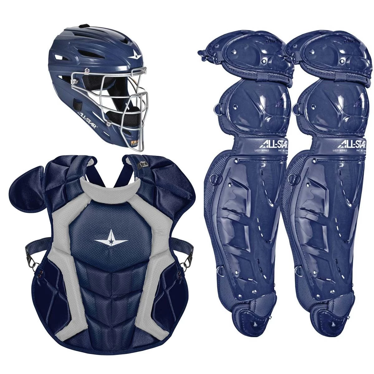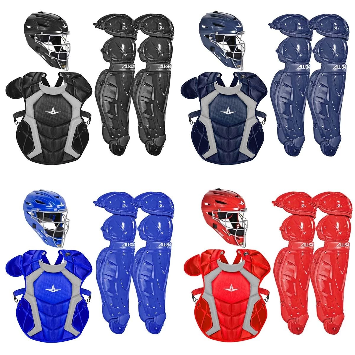 The Classic Pro adult baseball catching kit is perfect for the serious player looking for their first professional catching set or for outfitting a high school or college program. The kit includes a MVP2400 hockey-style mask, a CPCC1618S7X chest protector, and a pair of LG21WPRO leg guards. The MVP2400 helmet features flatter bars on the cage around the eye openings for increased range of view and durability. The CPCC1618S7X chest protector features UltraCool technology that lets heat escape to help keep you cool and dry. The CPCC1618S7X chest protector is also equipped with heart guard hardware that meets the NOCSAE commotio cordis chest protector standard. The LG21WPRO leg guards feature a triple knee design with 38 strategically placed UltraCool™ vent ports for breathability and a lightweight feel.