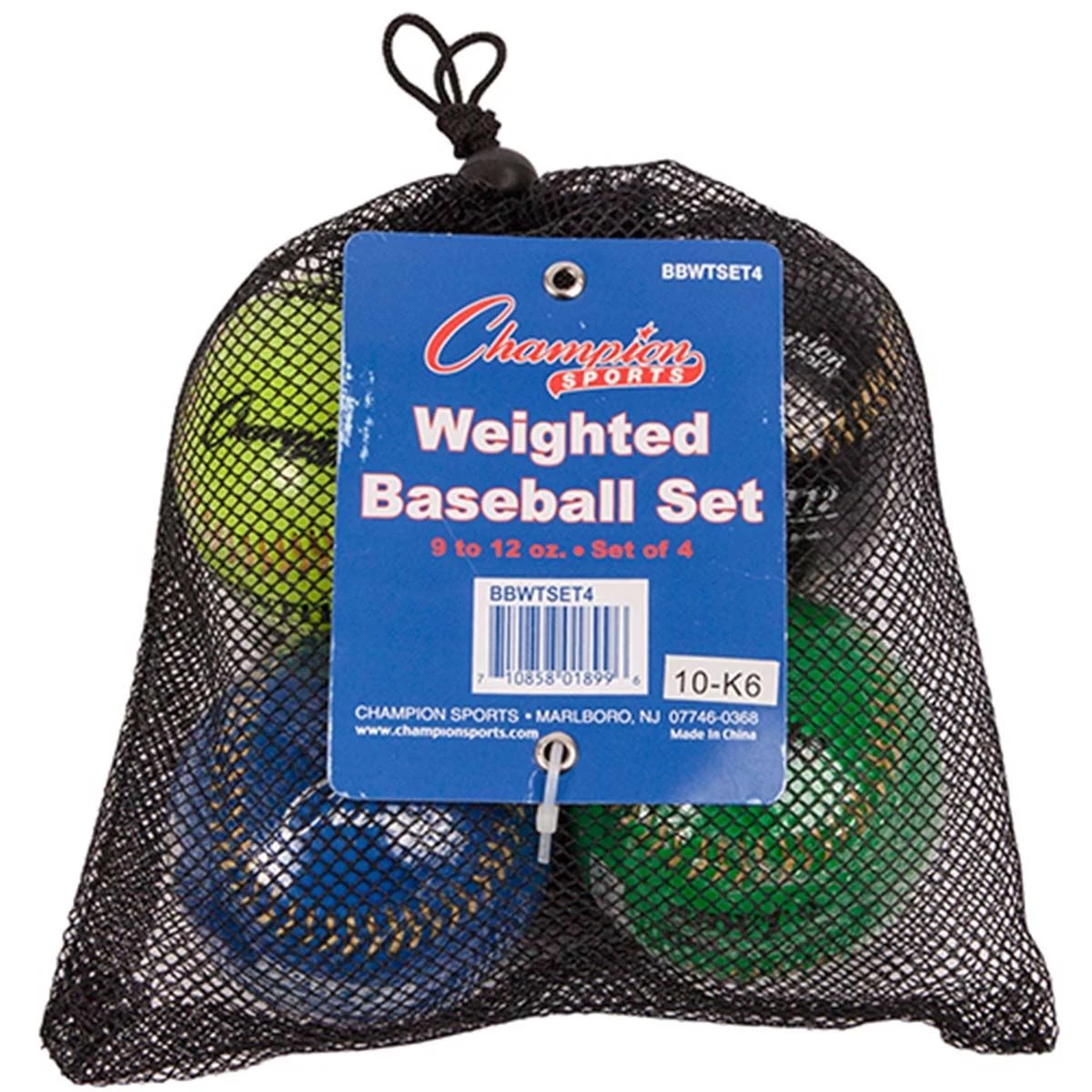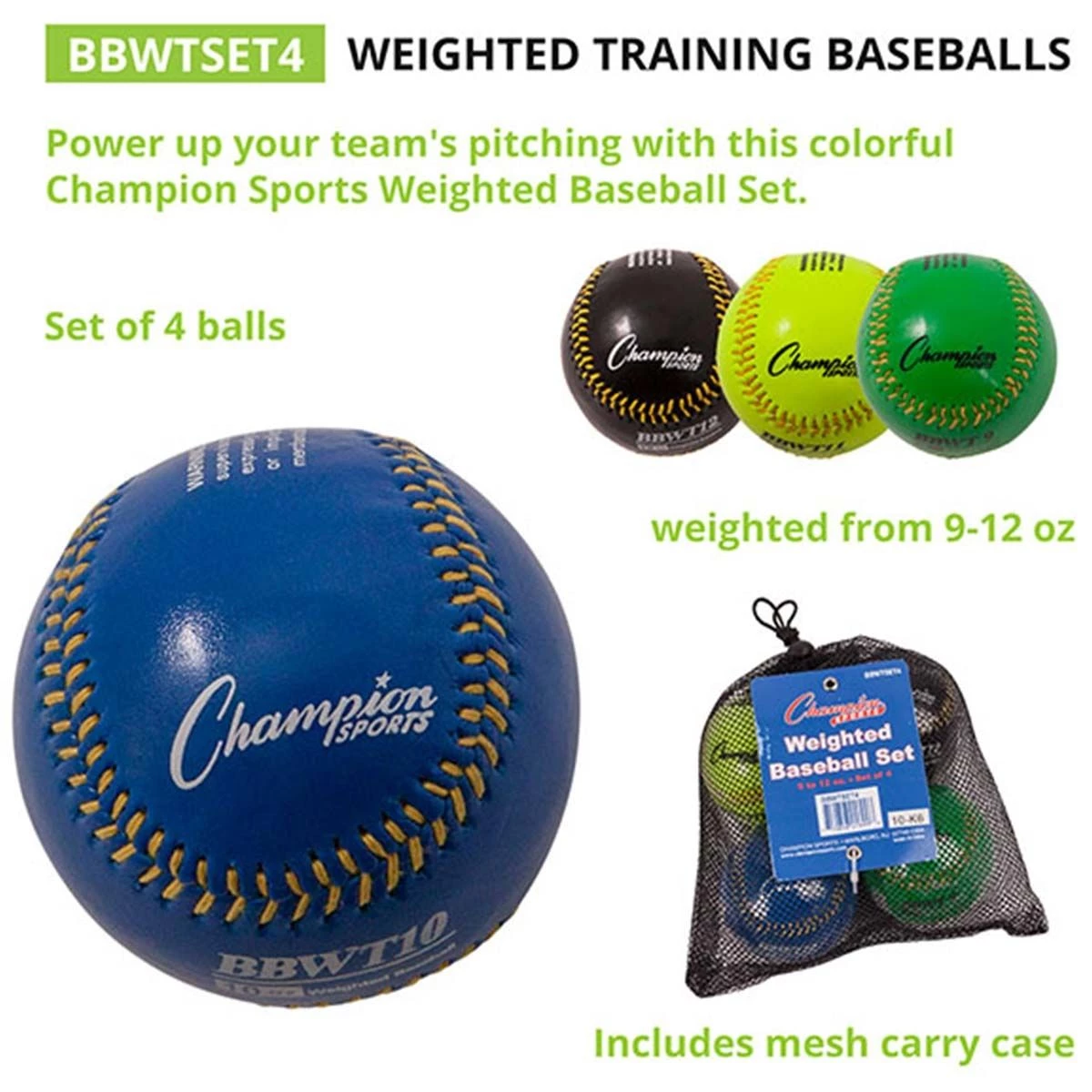 Strengthen your arm with these weighted training baseballs from Champion. These weighted baseballs have the same feel as a regular baseball and weigh from 9-12 oz. Use these weighted training baseballs for pitching to increase your velocity on the mound. Each set comes with 4 color-coded weighted balls. These training balls have a leather cover with rubber and cork core and include a mesh carrying case.