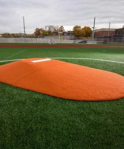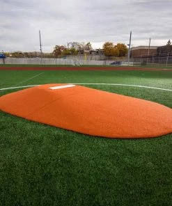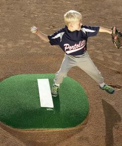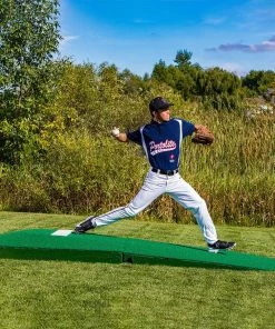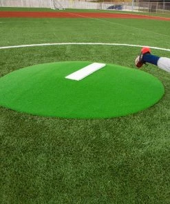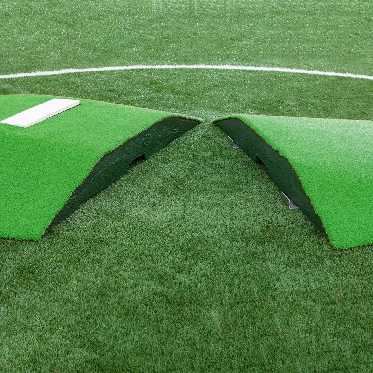 The Portolite two-piece game pitching mound features interlocking sections that make transportation, set-up/breakdown, and storage easy. This portable baseball pitching mound gives the pitcher the feel of a regulation baseball mound, while being light enough for field crews to move with ease. The mound’s high performing poly protected resilient core is reinforced with fiberglass for a solid, no bounce, yet cushioned mound that helps to reduce knee and ankle strain. The 10″ high portable mound is covered in high quality, green colored nylon AstroTurf. The mound features a simulated pitching rubber that is built to last ten times longer than a standard rubber. A hidden wear pad is built-in underneath the turf immediately in front of the pitching rubber for added durability when pitchers toe the rubber. Tapered edges and gentle slopes provide the highest level of comfort while also preventing falling off the mound when practicing pick off moves.