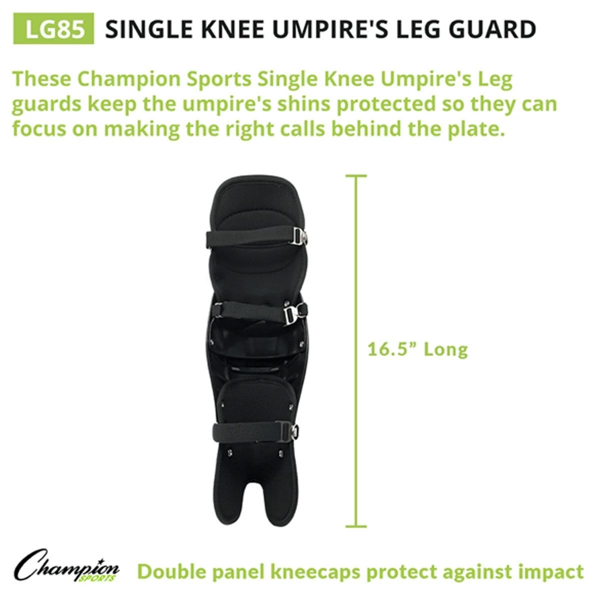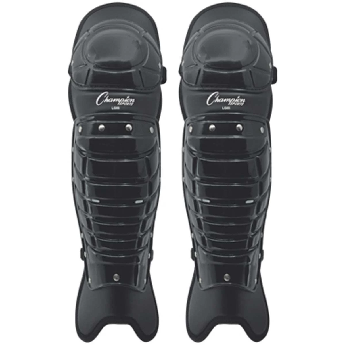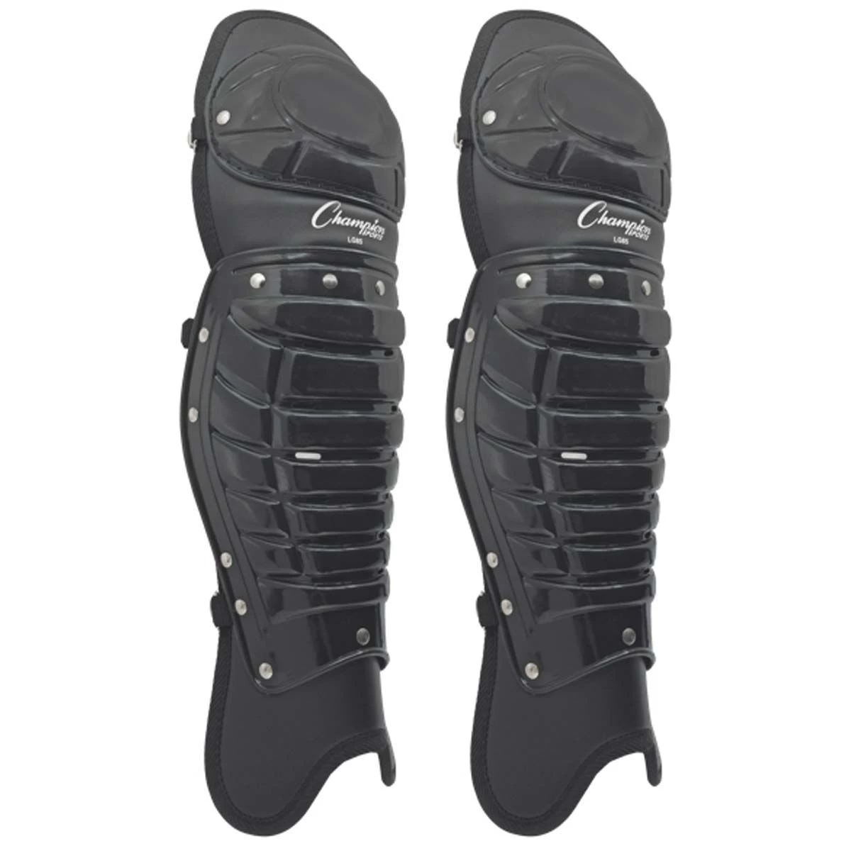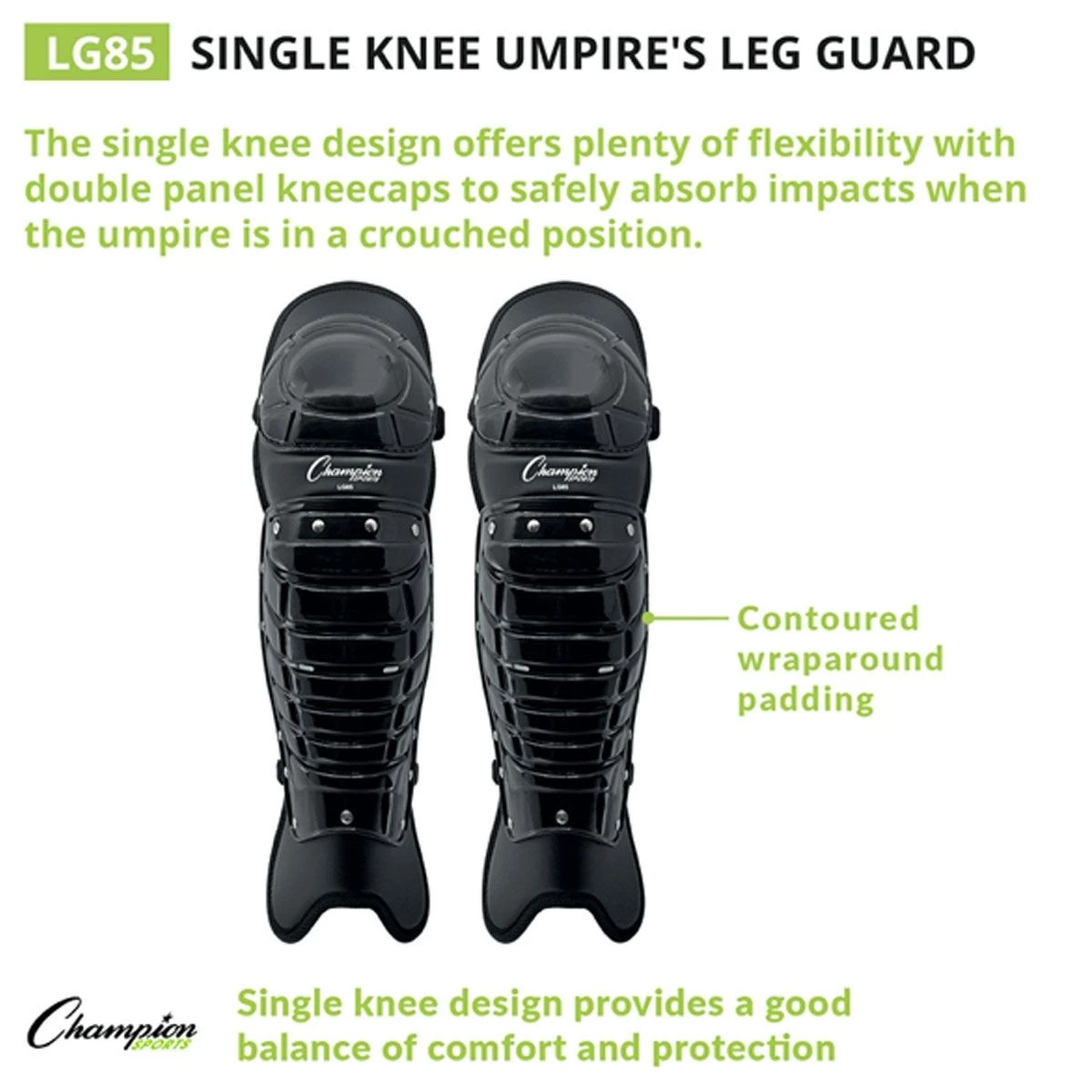 The Champion umpire shin guards are designed for maximum movement with contoured wrap-around padding for additional comfort and support. The Champion umpire shinguards offer flexibility with double panel kneecaps to safely absorb impacts and keep the umpire’s shins protected from wild pitches behind the plate.