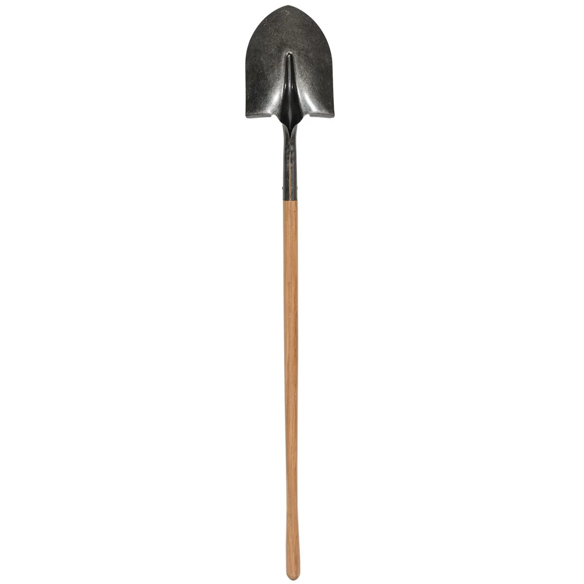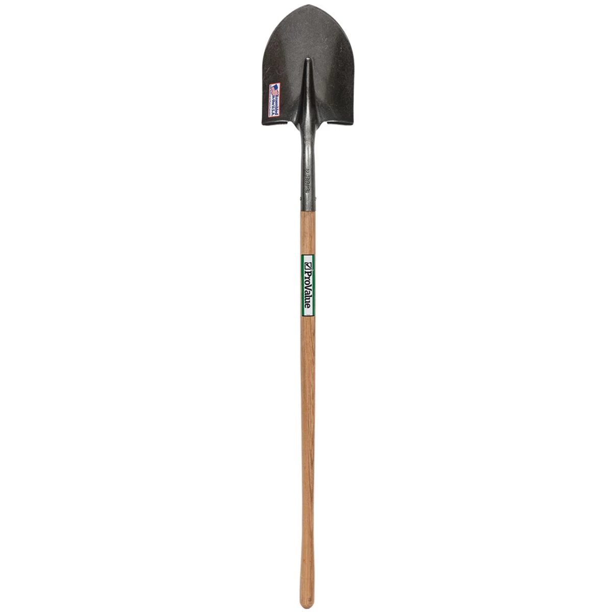 The pit shovel is made out of tempered steel and has a round point head.