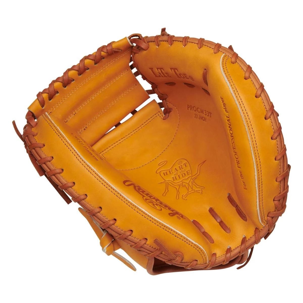 The Rawlings 33″ Heart of the Hide PROCM33T professional catcher’s mitt features the same pro-style patterns as used by top catcher’s in the major leagues. The mitt’s top grade USA steer-hide leather construction, deer tanned cowhide palm lining, soft full-grain finger back linings, and padded thumb sleeve provide more durability, comfort, and a better feel than any other catcher’s mitt. The thermoformed hand opening will keep your hand cool and ventilated all game. The glove has a solid 1-piece web design and will break in exactly to your liking, allowing you to handle the hardest fastballs along with the trickiest breaking balls. This 33″ catcher’s mitt will give you the very best protection, durability, and performance behind the plate.