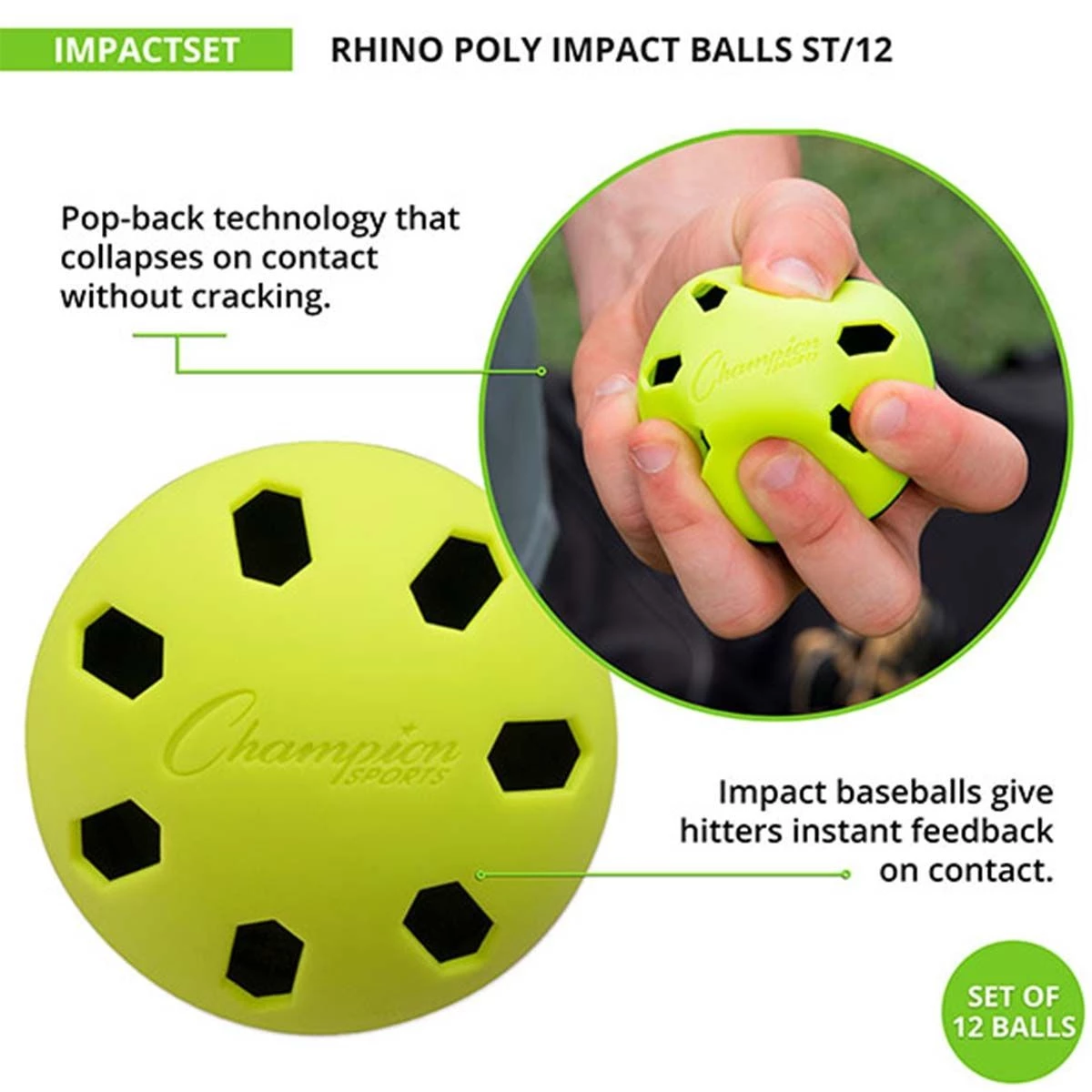The Rhino Poly impact training baseballs are perfect for daily training. These training baseball balls can withstand thousands of hits thanks to the durable material that they are created with. They are made with a pop-back technology which collapses upon contact without cracking. These are sold as a set of 12 balls and are your standard 9″ baseballs.