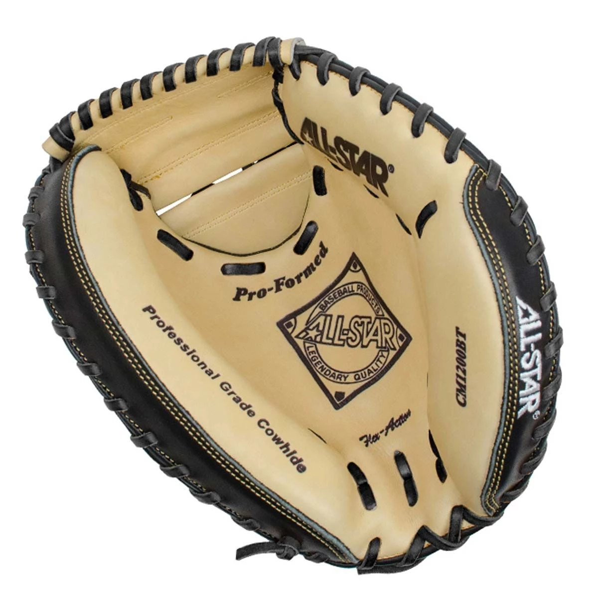 The All-Star CM3200SBT adult catcher’s mitt is the ideal mitt for the mid-level player. Select premium-tanned cowhide leather provides quick break-in and the black leather backing provides more structural support to the mitt. The CM3200SBT has US grade rawhide lacing and contrasting index finger padding which gives it the same look All-Star’s professional models.Β