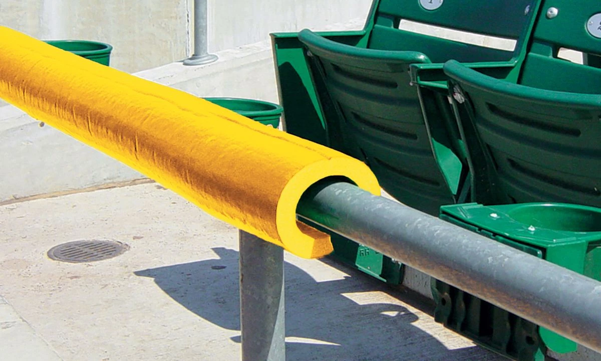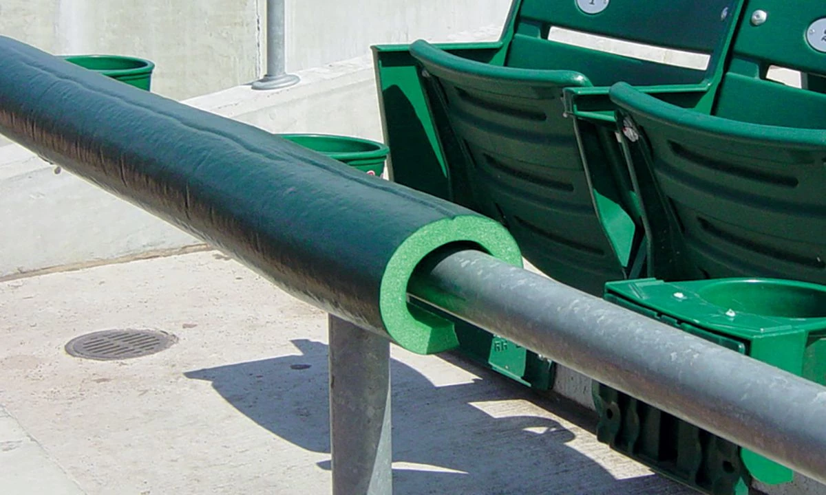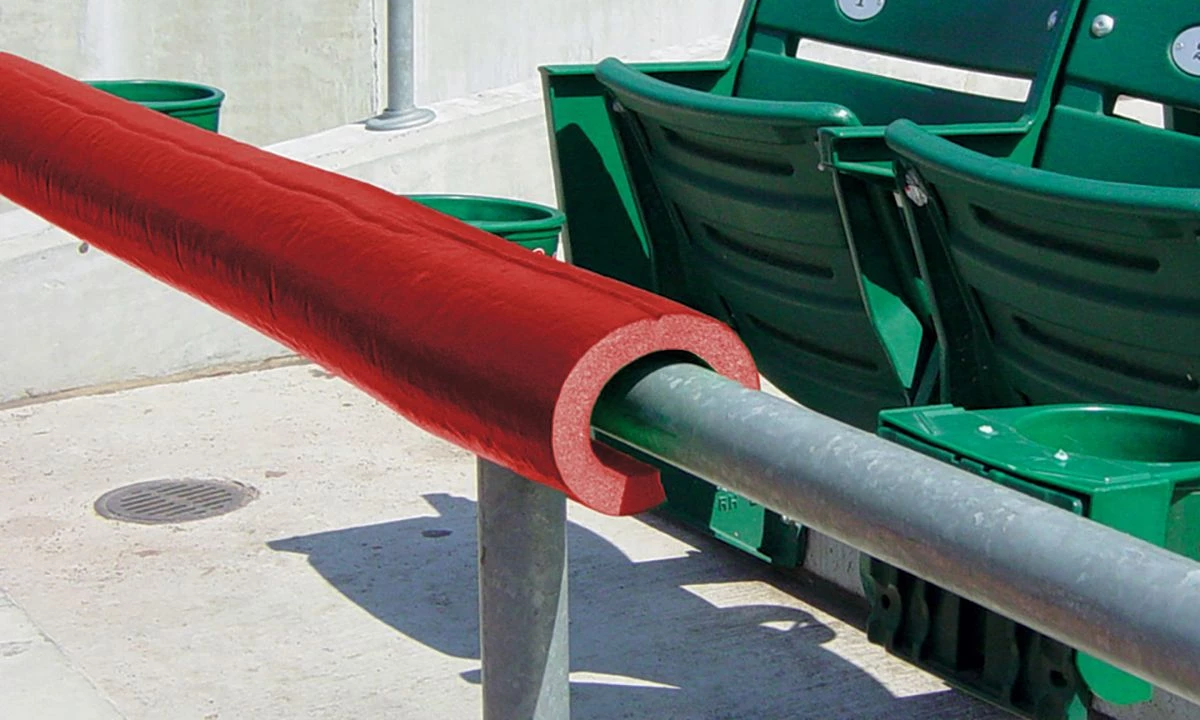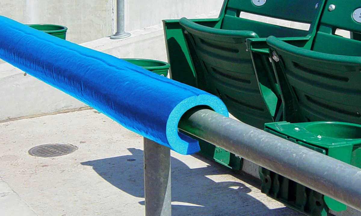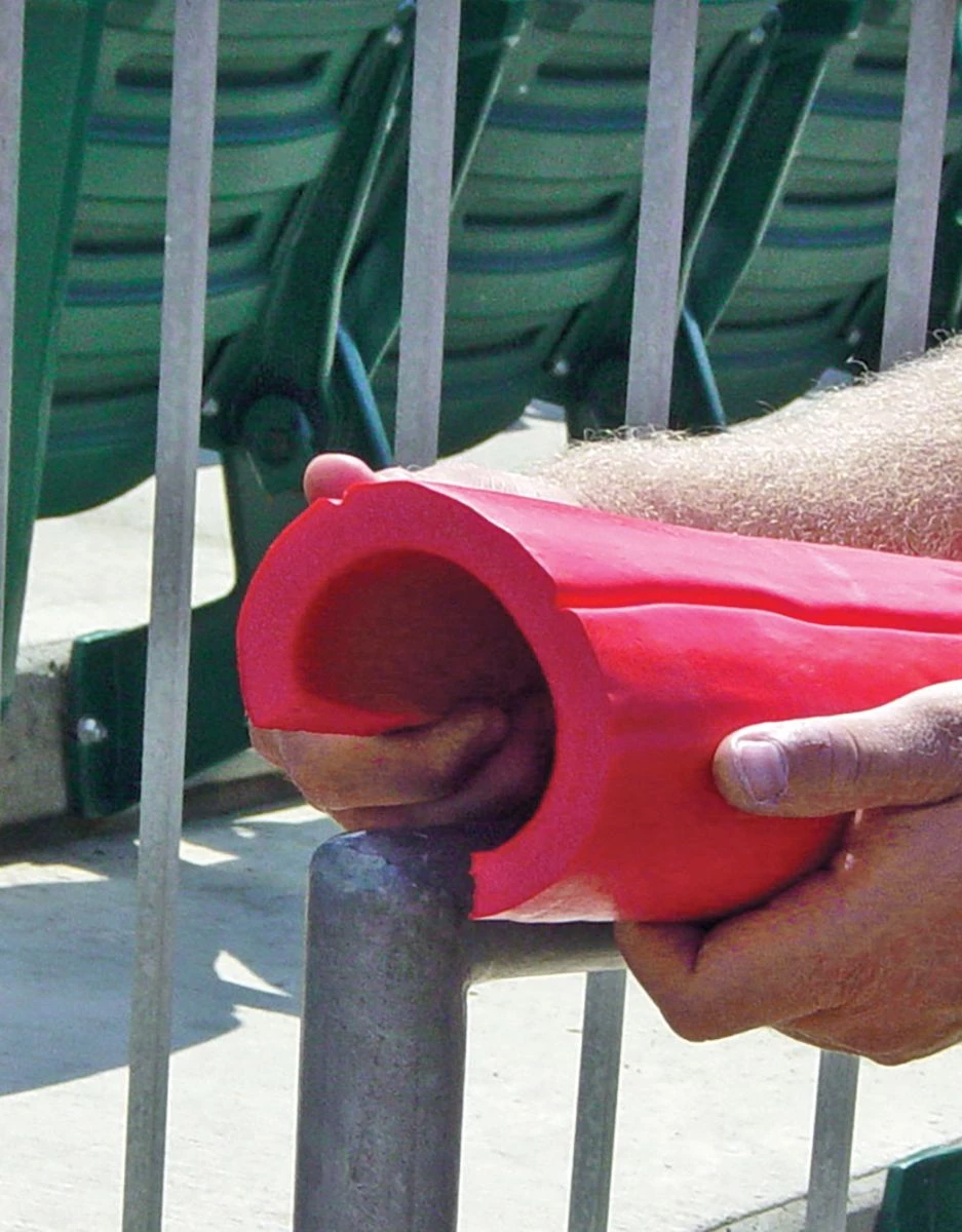 Protect your players and give your field that professional look with Premium SafeFoam padding. This foam padding is so versatile it can be used virtually anywhere around your field! Use the Premium SafeFoam padding as a batting cage deflector, pitching L-screen deflector or for your dugout rails. This foam padding goes over any chain link fence top, pole or rail 2β or less in diameter. The padding is ΒΎβ thick with an extra-durable skin coating. The 8′ long pieces areΒ pre-slit for easy installation and can be easily cut down to fit any application.