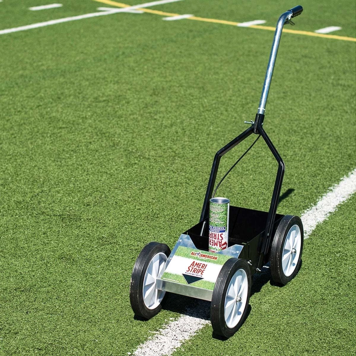 The Ameri-Stripe Liner 500 paint marking machine has the sprayer in the middle of the machine to prevent wind interference, giving you a cleaner line on your field. Line width can be adjusted from 2 inches to 4 inches depending on your needs. This machine has a sturdy, all-steel construction and large 10 inch wheels that provide a smooth rolling surface and excellent maneuverability, even on rough surfaces. This liner works with 18 oz. or 20 oz. aerosol paint cans only.