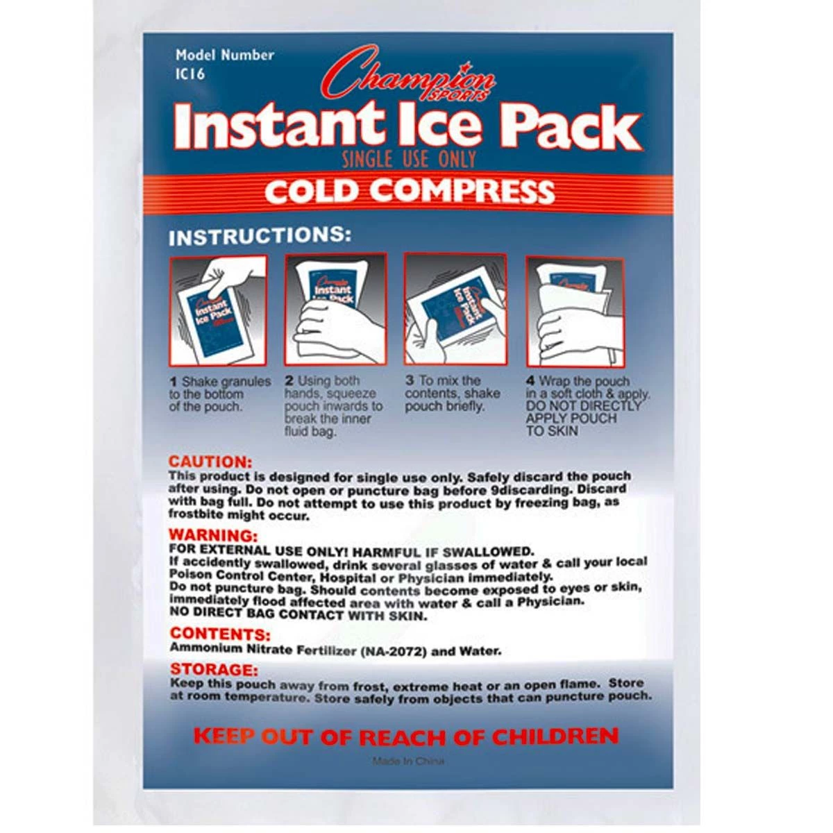 The instant cold packs from Champion offer the convenient first aid you need at an unbeatable price. Simply squeeze the packs to activate.